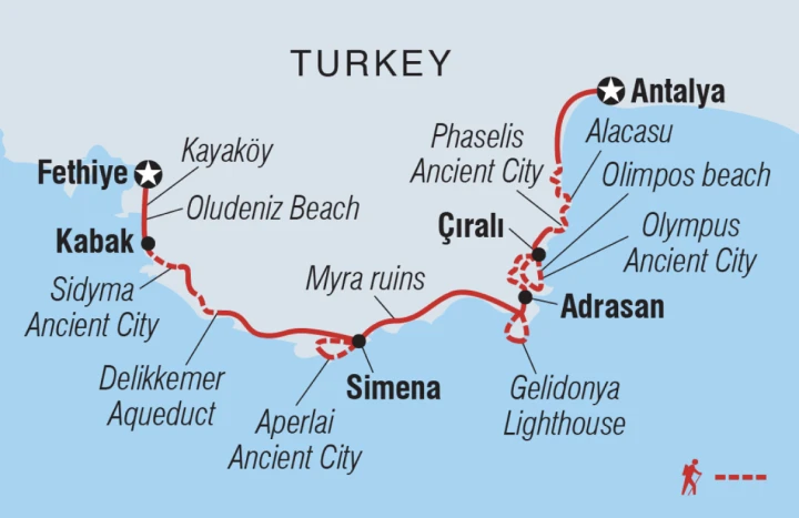 Likijos kelias – tai virš 500 km. ilgio žygiavimo takas Turkijoje, vedantis palei Viduržemio jūrą nuo Fethiye iki Antalijos priemiesčių – regionu anksčiau žinomu Likijos vardu. Priešistoriniame laikmety šis takas buvo naudojamas Likijos tautos žmonių, kurie vėlesniame – Bronzos amžiuje įsiliejo į romėnų kultūrą. Čia vis dar sutinkamos išsilaikiusios runos, liudijančias apie kadaise klestėjusius miestelius ir Likijos žmonių kulūrą. Likijos kelias įtrauktas į daugelio pėsčiųjų takų gražiausiųjų dešimtuką. Keliautojams jis siūlo ne tik kerinčius vaizdus, šiltą žydrą jūrą ir nuolat besikeičiančius kraštovaizdžius, bet ir užburia savo legendomis ir istorija alsuojančia atmosfera – retai kur žygiuodamas kalnais gali akmenį supainioti su akmeninės skulptūros nukritusia galva ar pražygiuoti tarp priešistorėje kadaise klestėjusio miesto sienų. Pasileiskite į savo gyvenimo kelionę, kurios akimirkos išliks nepamirštamos!